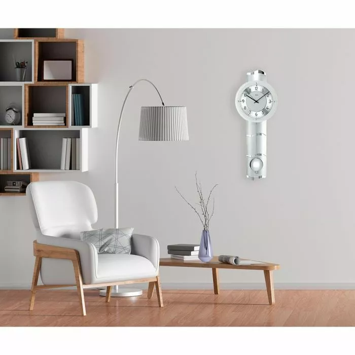 sonstiges: Korpus aus gebürstetem Aluminium mit Holzträgerelementen und chromfarbenen Applikationen, Mineralglas-Abdeckung, automatische Einstellung der Uhrzeit bei Inbetriebnahme und Umstellung von Sommer- und Winterzeit, selbstständig beginnende Pendelbewegung