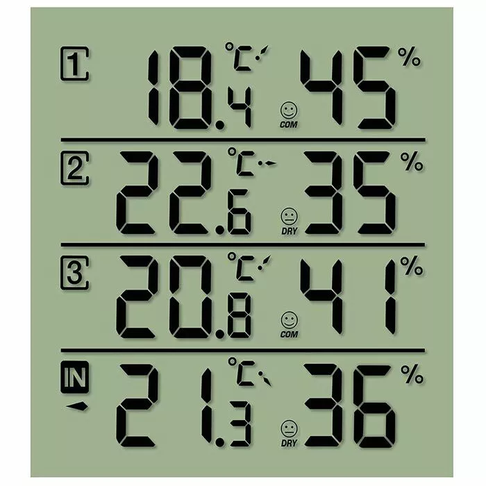 sonstiges: einstellbarer Alarm für Temperatur und Luftfeuchtigkeit, MIN.-/ MAX.-Funktion, Darstellung in °C oder °F, Außensensoren spritzwassergeschützt, großes übersichtliches Display, zum Hängen oder Stellen, schwarze Basisstation