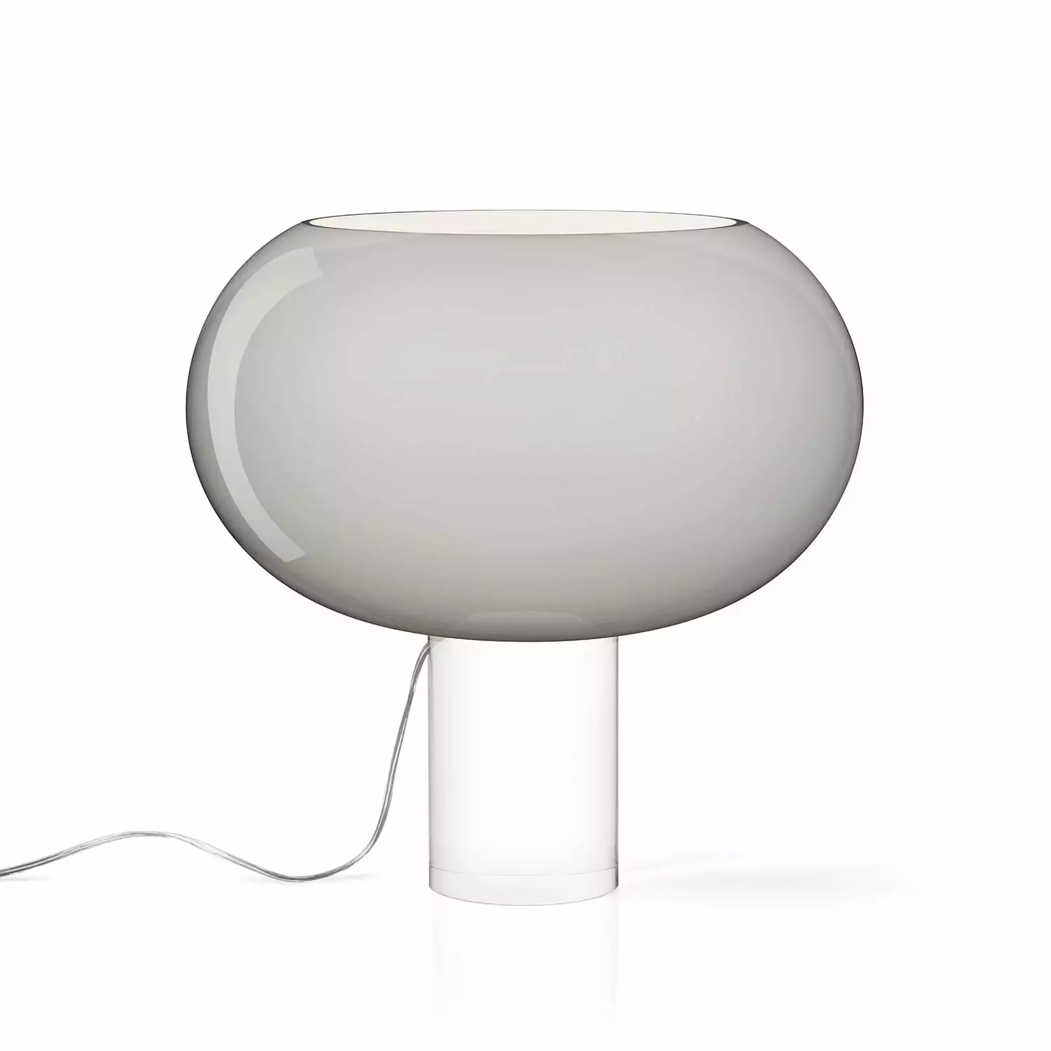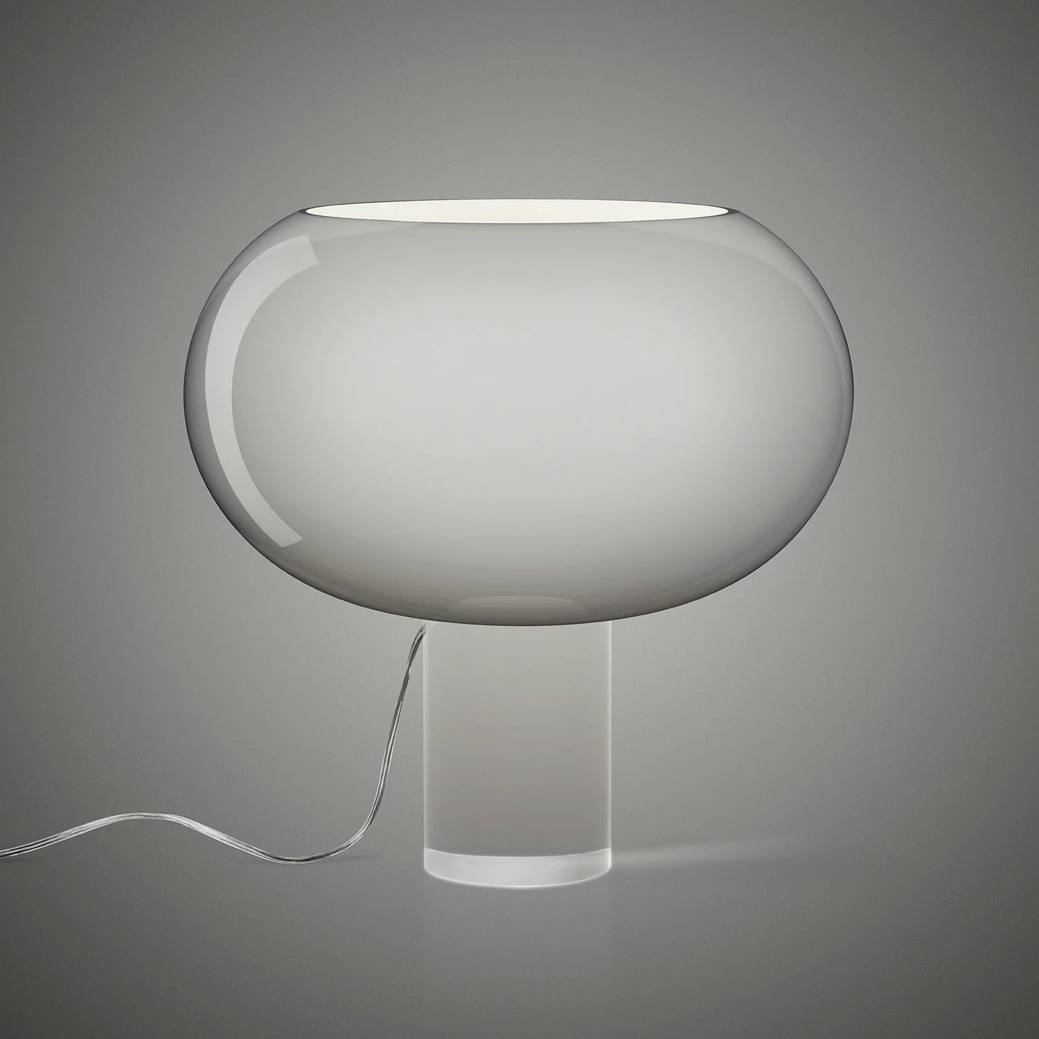 Tischleuchte, wo das geblasene Glas die Hauptrolle spielt, mit einer transparenten Basis kombiniert, ihre reinen Formen betont.