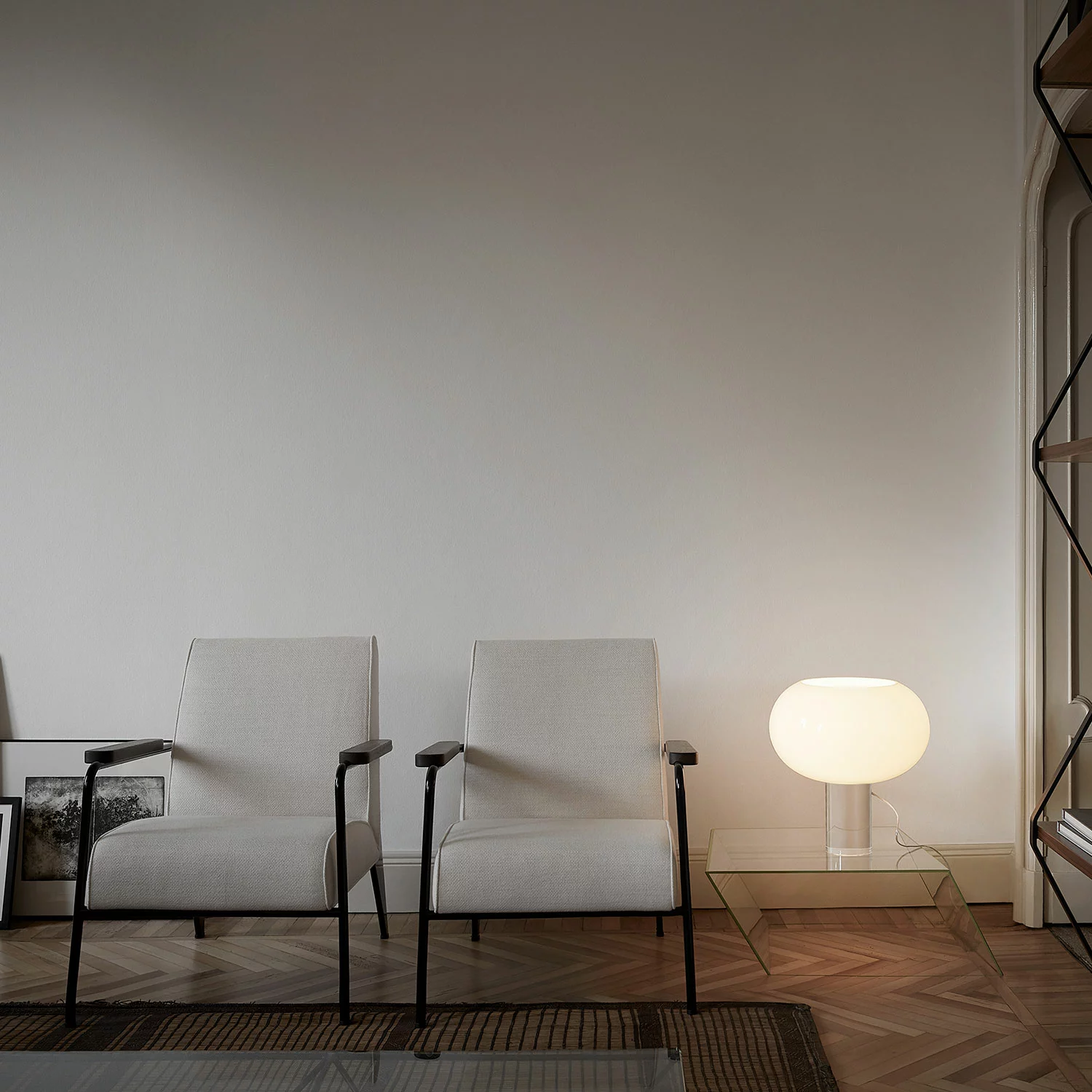 Tischleuchte, wo das geblasene Glas die Hauptrolle spielt, mit einer transparenten Basis kombiniert, ihre reinen Formen betont.
