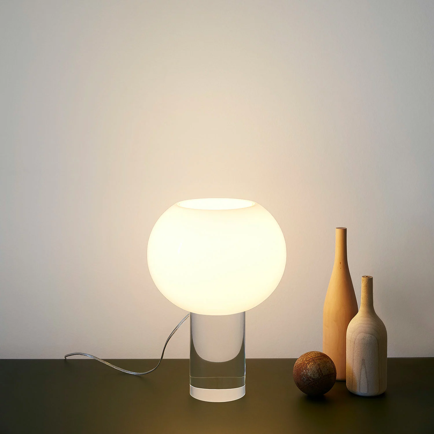 Tischleuchte, wo das geblasene Glas die Hauptrolle spielt, mit einer transparenten Basis kombiniert, ihre reinen Formen betont.