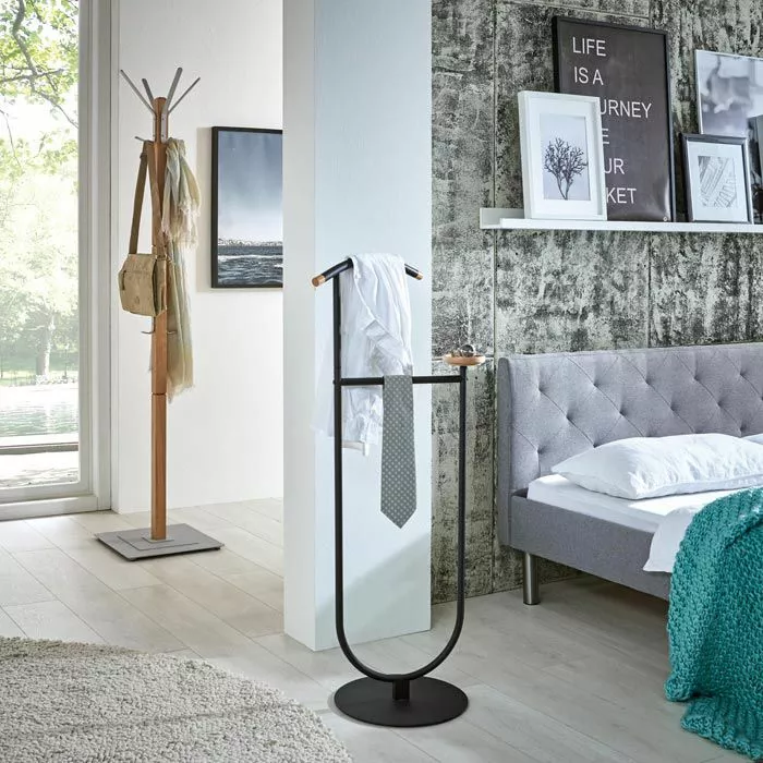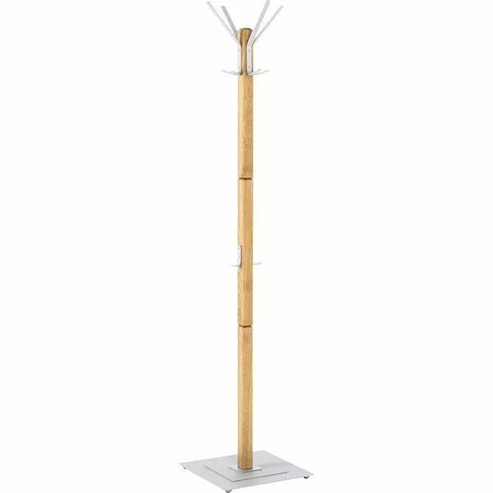 sonstiges: aus Eiche-Massivholz, mit 4 Hut- und 6 Kleiderhaken, Haken und Standfuß aus Metall in alufarben, standsicher durch schweren Standfuß