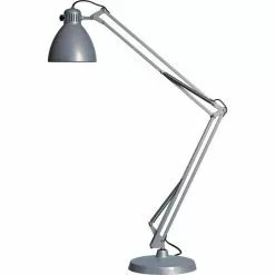 sonstiges: Dimmschalter am Leuchtenkopf, mit Opaldiffusor für weiches blendfreies Licht, integrierter Timer, welcher nach 4 oder 9 Stunden automatisch abschaltet, Gelenkarm aus Stahl, Leuchtenkopf aus Aluminium, in RAL 9006 aluminiumgrau, schwenkbar um 360 Grad, Aufbau wahlweise mittels Metallklemme zum Fixieren an Tischen bis zu einer Stärke von 50 mm oder auf dem stabilen Standfuß (5 kg)