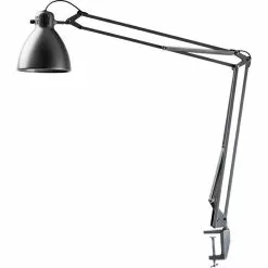 sonstiges: Dimmschalter am Leuchtenkopf, mit Opaldiffusor für weiches blendfreies Licht, integrierter Timer, welcher nach 4 oder 9 Stunden automatisch abschaltet, Gelenkarm aus Stahl, Leuchtenkopf aus Aluminium, in RAL 9006 aluminiumgrau, schwenkbar um 360 Grad, Metallklemme zum Fixieren an Tischen bis zu einer Stärke von 50 mm