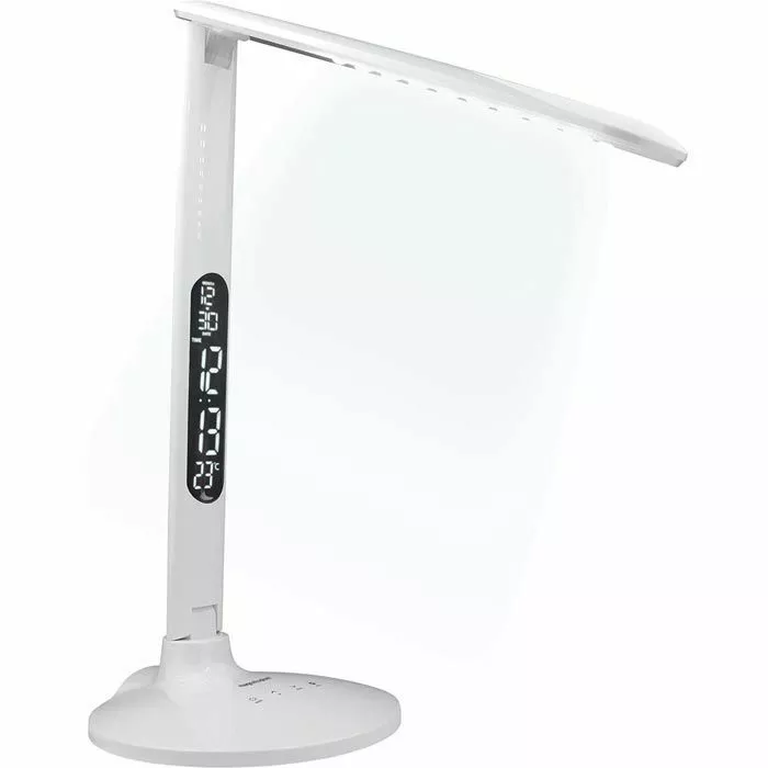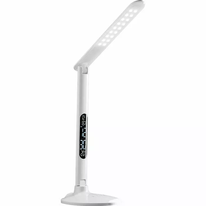 sonstiges: mit Touch-Dimmer am Fuß, USB-Anschluss zum Laden mobiler Geräte, LED-Anzeige von Uhrzeit, Kalender und Temperatur, Arm mit Dreh- und Kippgelenk, Leuchtenkopf klappbar