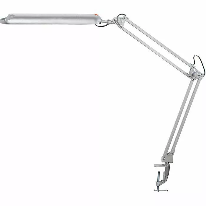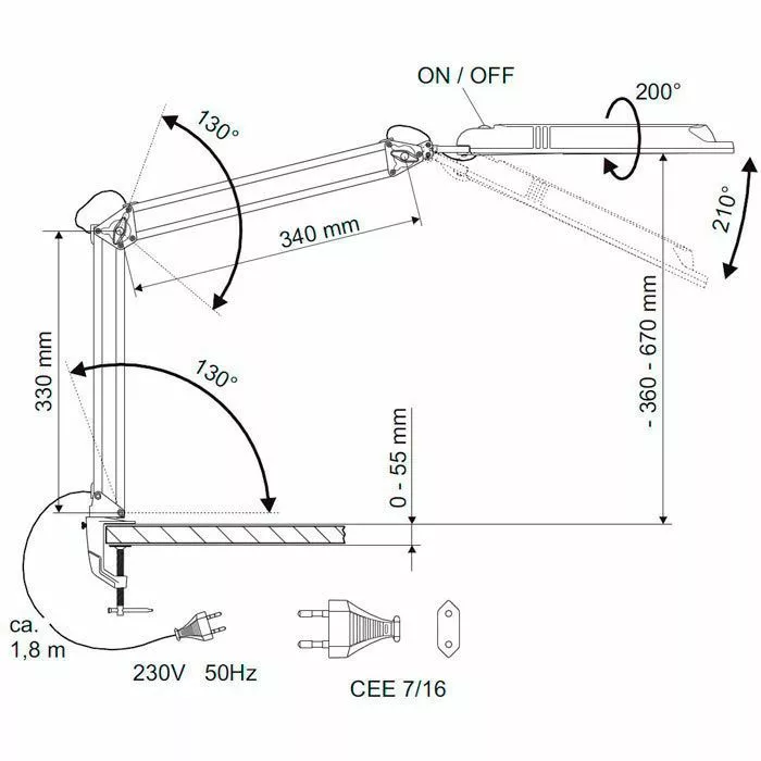 sonstiges: mit Gelenkarm aus Metall und drehbarem Leuchtenkopf aus Kunststoff, Schalter am Leuchtenkopf, 1,8 m Netzkabel, Metallklemme zum Fixieren an Tischen bis zu einer Stärke von 55 mm