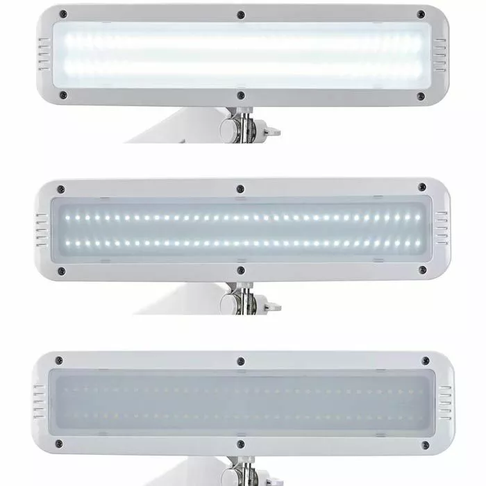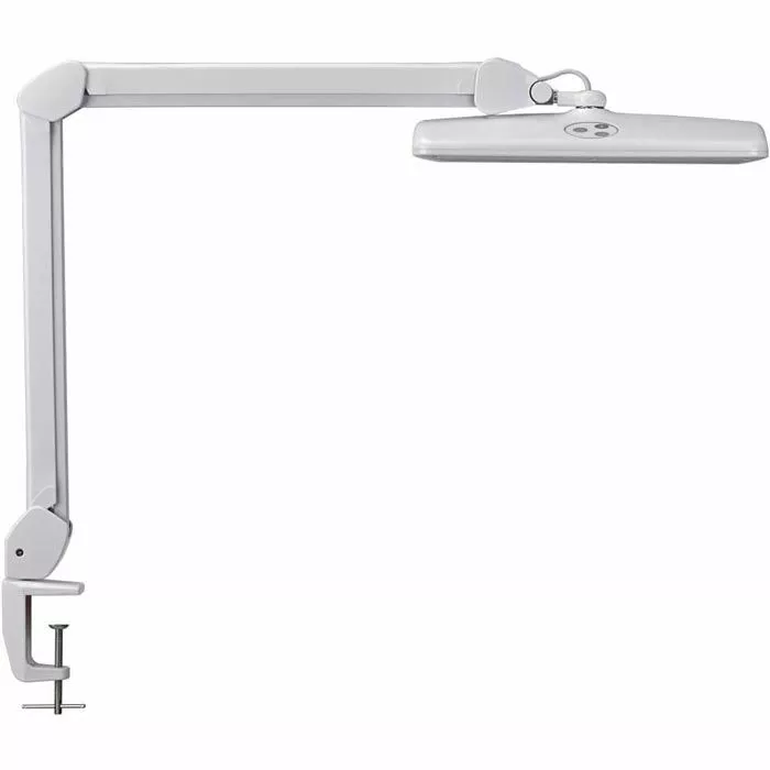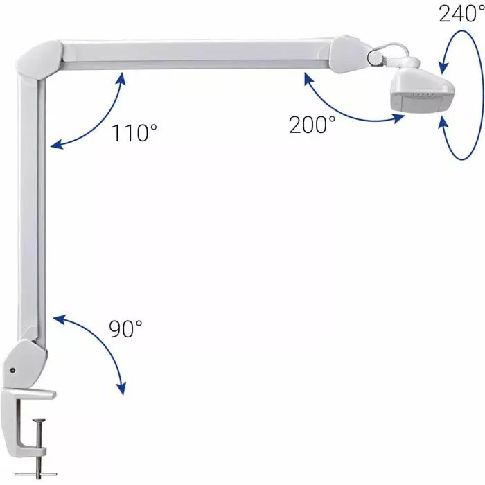 sonstiges: 360° drehbarer Gelenkarm aus Metall, dreidimensional verstellbarer Leuchtenkopf aus Kunststoff, Bedienfeld am Leuchtenkopf, Metallklemme zum Fixieren an Tischen bis zu einer Stärke von 63 mm