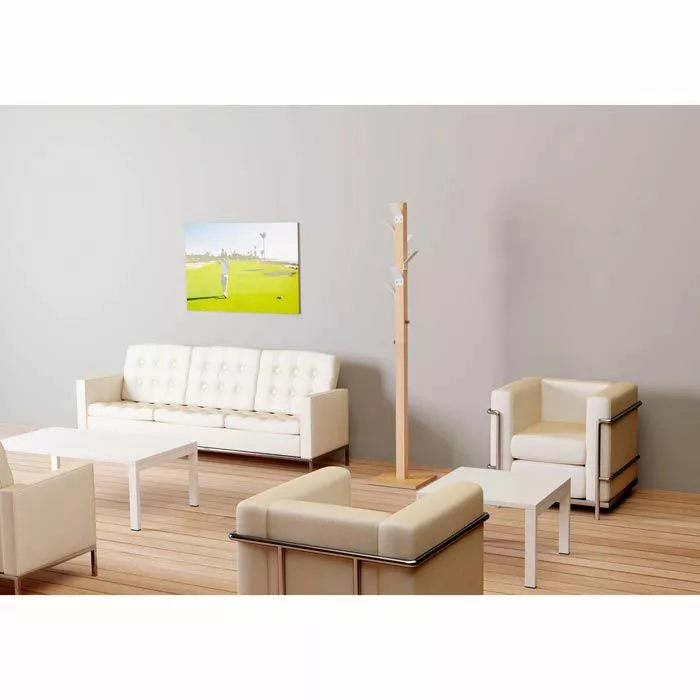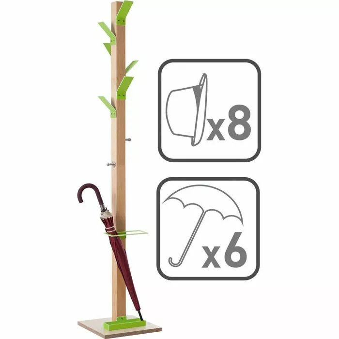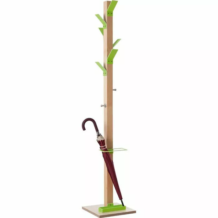 sonstiges: 6 farbige Kleiderhaken aus robustem Polystyrol und 2 zusätzliche Haken aus verchromtem Stahl, Massivholz-Ständer transparent lackiert, Schirmhalter mit Tropfmulde, standsicher durch wasserfesten Standfuß aus Sperrholz