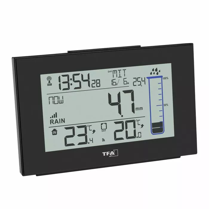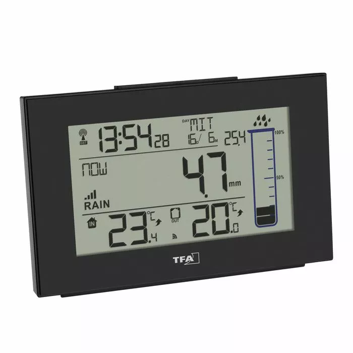 sonstiges: stündliche, tägliche, wöchentliche, monatliche oder jährliche Anzeige der Regenmesswerte, 24-Stunden-Regenalarm, Temperaturmesswerte in °C oder °F