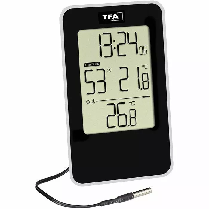 sonstiges: 130 cm langer und wasserdichter Messfühler, Anzeige von MAX- und MIN-Werten, Quarzuhr, für Tischaufstellung oder Wandaufhängung geeignet