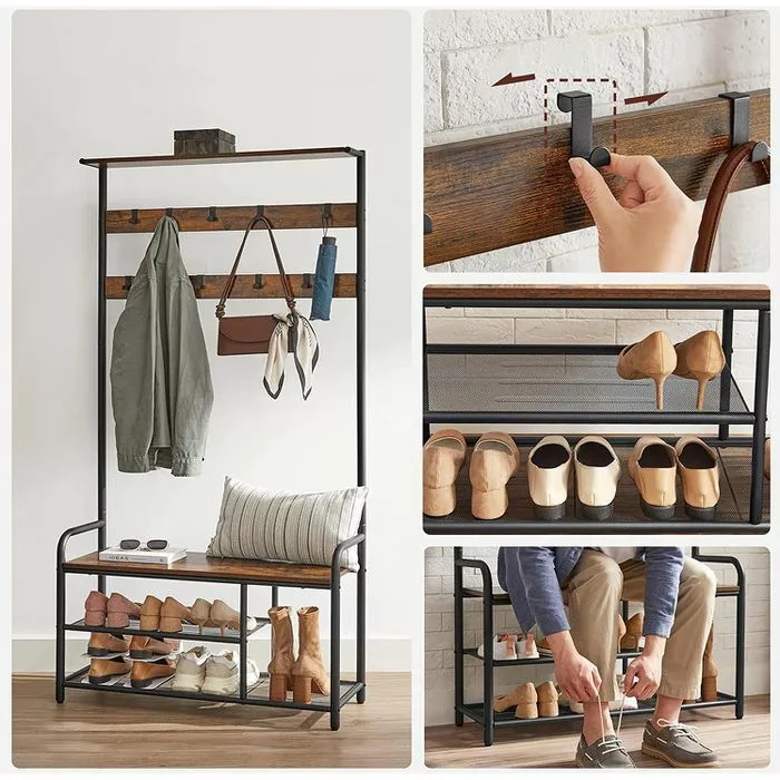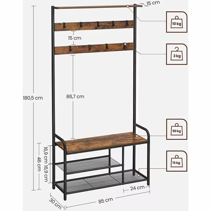 Vasagle Garderobenständer HSR409B01, Vintage, Mit 9 Haken, Metall / Holz, Schwarz / Braun
