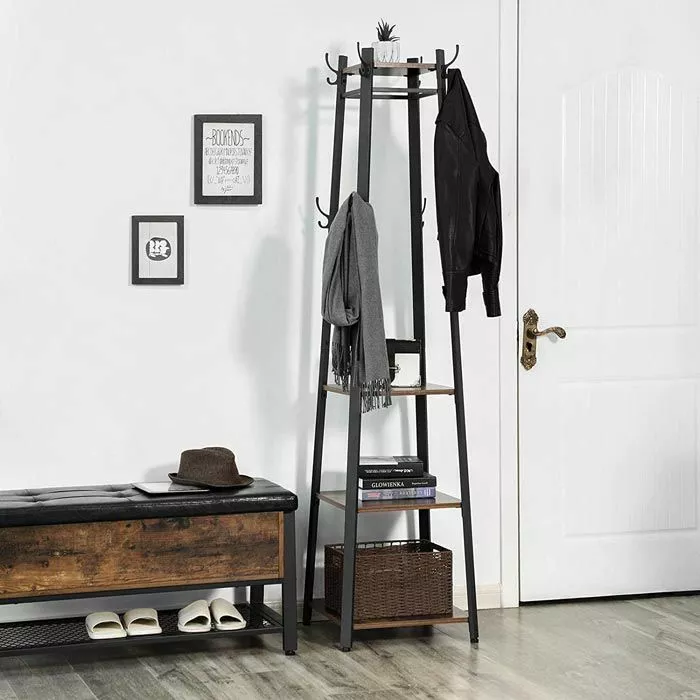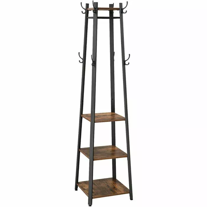 sonstiges: 16 Haken, Metallgestell mit Ablagen aus Spanplatte in rustikalem vintage-braun