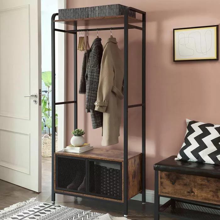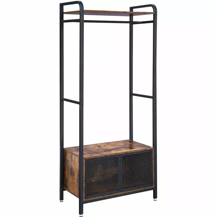 sonstiges: standsicheres Metallgestell mit Kleiderstange, Schuhschrank aus Spanplatte in rustikalem vintage-braun, mit 2 Gittertüren, Kleiderstange bis 20 kg belastbar, Schuhschank bis 60 kg belastbar