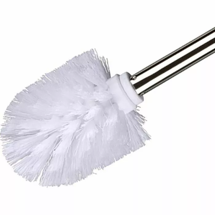 • Glänzender, rostfreier Edelstahlstiel mit wechselbarem, weißem Bürstenkopf